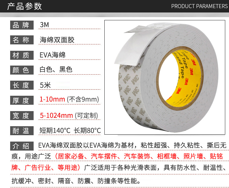 介紹EVA海綿雙面膠以EVA海綿為基材,粘性超強、持久粘性、撕后無